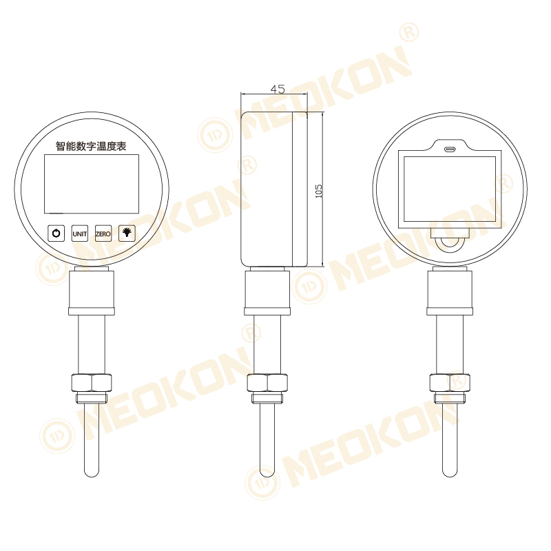 100mm超大表盤,55x55mm超大液晶5位顯示,溫度精度高,低電報(bào)警、單位切換等多種輔助功能,探頭長度及螺紋,溫度量程可定制